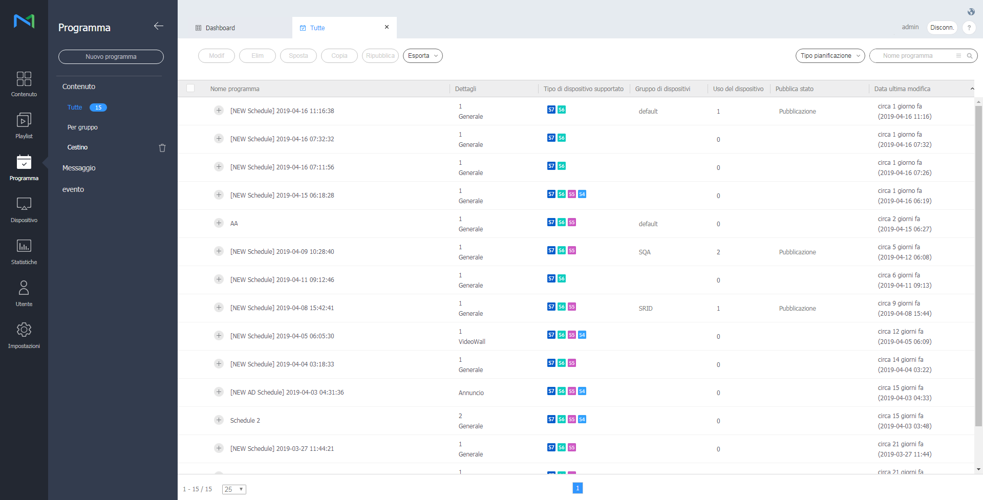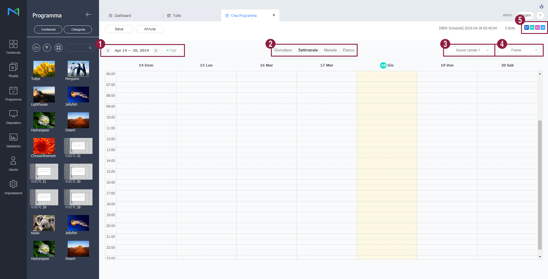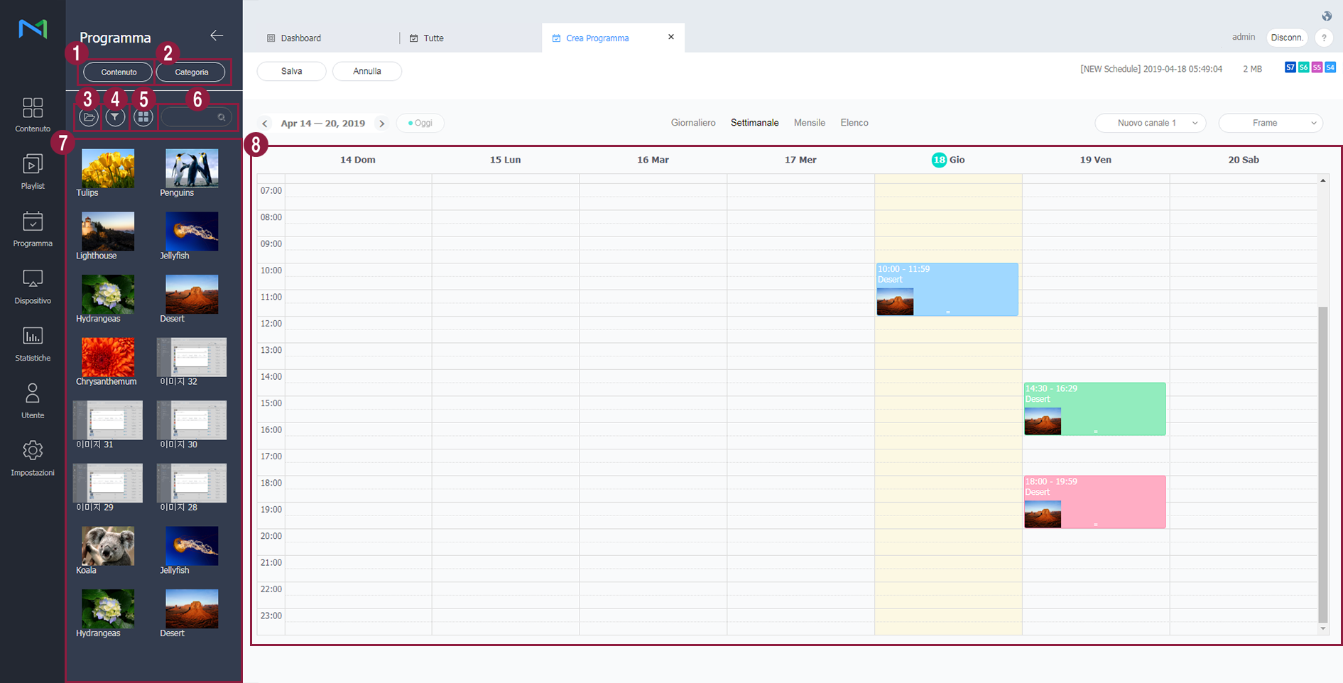 2 Consente di visualizzare la barra dei menu principale di MagicINFO Server. Cliccare su una voce di menu per visualizzarne la pagina delle funzionalità.